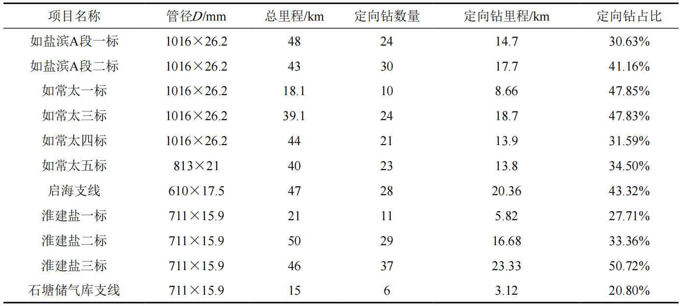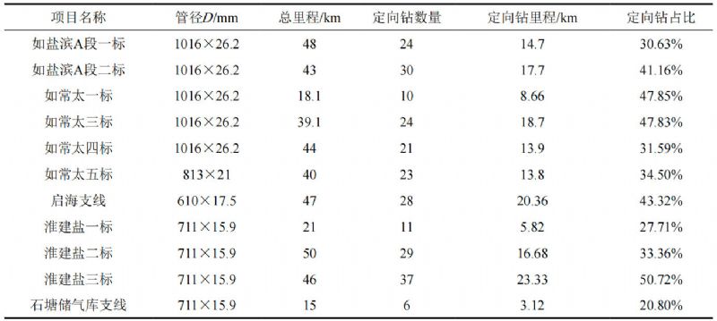 表 1 江苏沿海管道建设各标段定向钻工程统计表