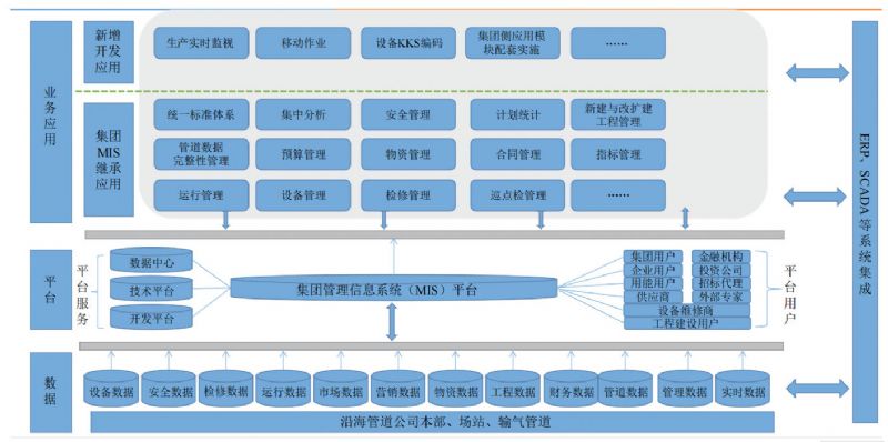 (3)信息化应用程度不高 。公司MIS(Management Information System)管理信息系统(图 3),一方面充分利用集团已建MIS成果,在现有基础上扩展、深化;另一方面,要根据沿海管道公司业务特点进行针对性开发。目前处于运营初期阶段,信息化建设项目零散且缺乏整体协调,尚不具备数据分析等功能,员工应用尚不够熟练,信息化工具的应用有待进一步开发完善。