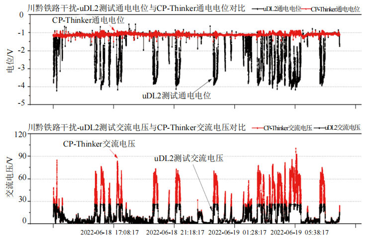 图 4 UDL2和CP-Thinker同一位置/时段记录的交流电压及管地电位
