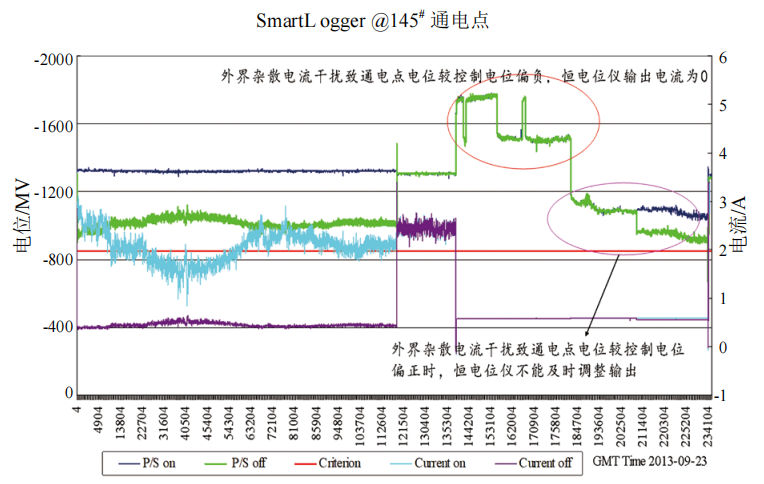 在直流杂散的检测过程中,用CP-Thinker记录仪记录恒电位仪的输出电流和通电点电位。
