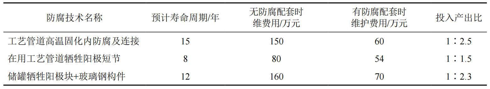 相较于常规站场工艺管网更换、储罐维护,应用站场综合防腐技术经济效益显著(表 4)。