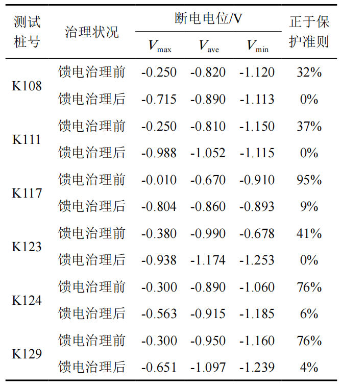实验结果表明,馈电段管道的断电电位基本稳定在SY/T0087.4标准要求的评价指标﹣0.85 VCSE~ ﹣1.20 VCSE区间,无明显正向偏移,表明治理措施能抑制杂散电流干扰,使区间内管线处于有效保护状态。若区间内存在极个别欠保护位置,后期应考虑通过施加极性排流的方式进一步优化防护效果。