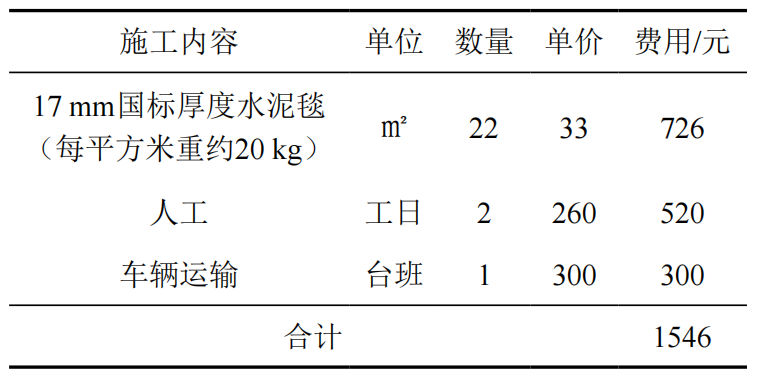 以一处普通沟渠防护施工为例,沟宽2 m、深1 m、防护长度6 m,需防护施工的表面积约21.6 ㎡,采用15 mm~20 mm厚度的混凝土帆布,单件平面尺寸宽2 m,长3 m~5 m,重量通常为20 kg/m²,费用合计1546元(表 1)。