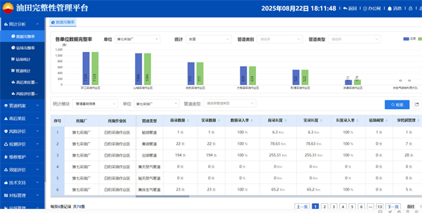 管道档案实现管道基础数据采集“全覆盖”,包括2大模块50项内容,通过对环江油田6105 km油气水管道基线检测等数据全覆盖采集,实现管道静态、动态参数“可视化追踪”“一键式查询”,做到数据资源共建共享。