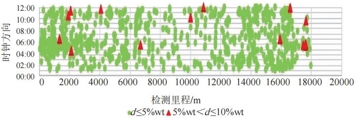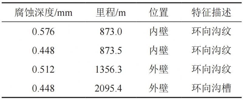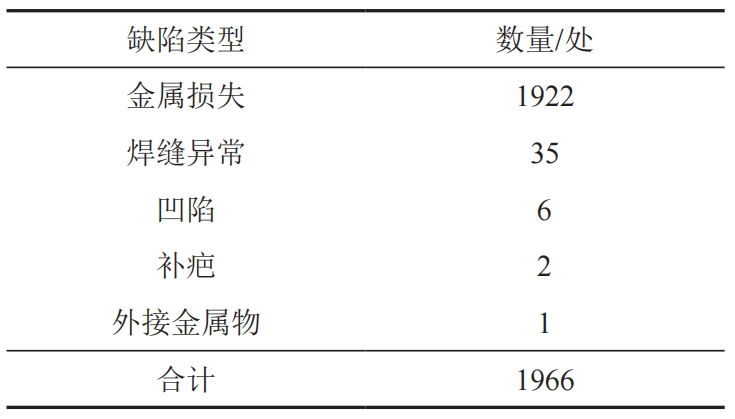 检测发现的1922处金属损失中,外部损失1667处(占86.7%),内部损失255处(占13.3%),金属损失深度d ≤5%wt有1895处,占比98.6%;5%wt< d ≤10%wt有27处,占比1.4%(d 为管道金属壁的实际腐蚀损失深度,wt 为管壁公称厚度,单位均为mm)。