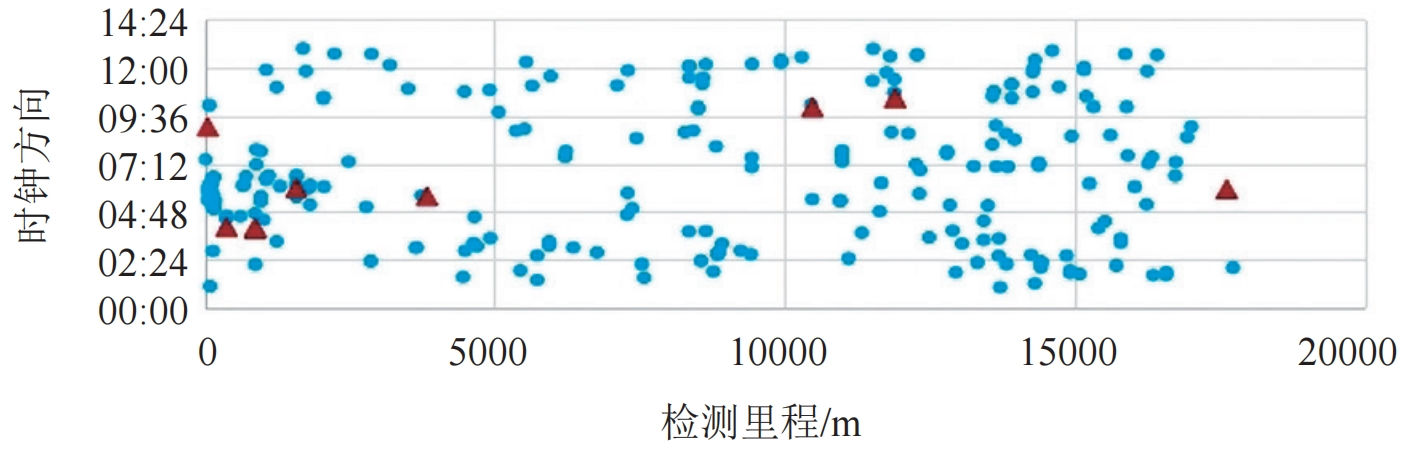 外部金属损失和内部金属损失周向位置沿检测里程分布分别见图 1、图 2。