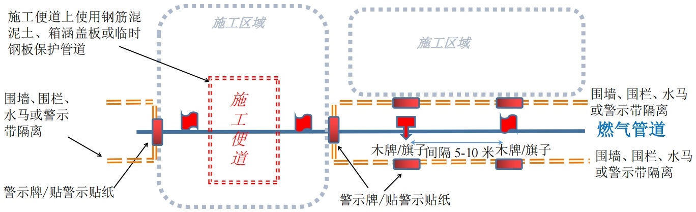 落实施工现场保护措施。落实第三方施工“现场及周边管道巡查、安全保护告知、保护方案制定及保护措施落实、现场安全技术交底、保护协议签订、风险点旁站监护指导”6个百分之百。对审批通过后的施工,要与建设、施工、设计、监理等单位一同签订管道保护协议并在施工前到现场交底,明确管道走向、埋深、材质、压力等级等关键信息,设置临时警示标识,确认项目施工内容及管道保护措施。施工期间燃气企业派专人全程旁站监护,对风险较大的第三方施工现场加装移动视频监控,后台可随时调阅现场施工情况,确保落实管道保护相关措施。由于埋地管道的不可见性,且受环境地貌变化、探管误差等因素影响,管道位置可能会存在误差,需通过人工分层探挖的方式获得准确位置及埋深数据。管道安全保护范围内禁止使用大型机械施工,防止大型机械挤压或误碰管道,同时避免将施工便道设置在管道上方,因特殊情况确实无法避让的,应设置钢筋混凝土箱涵来保护管道运行安全。警示标识按照统一设置标准(图 1),对施工现场管道位置、警戒范围进行标示,做到一目了然,并在日常巡查中检查其完好情况。