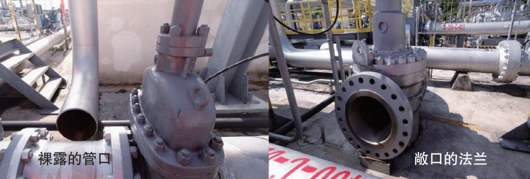 (2)改扩建管理不规范。某成品油管道运行中的站场增加反输工艺改造工程处于停滞状态,阀门和管道均为简易支撑,管口和法兰也没有封堵保护(图 5),现场也没有施工相关人员监管,该管道多个站场均有不同程度的此类现象。施工方对站场改造工程管理失控,不仅难以保障工程建设质量,也增加了在役管道运行安全的风险。