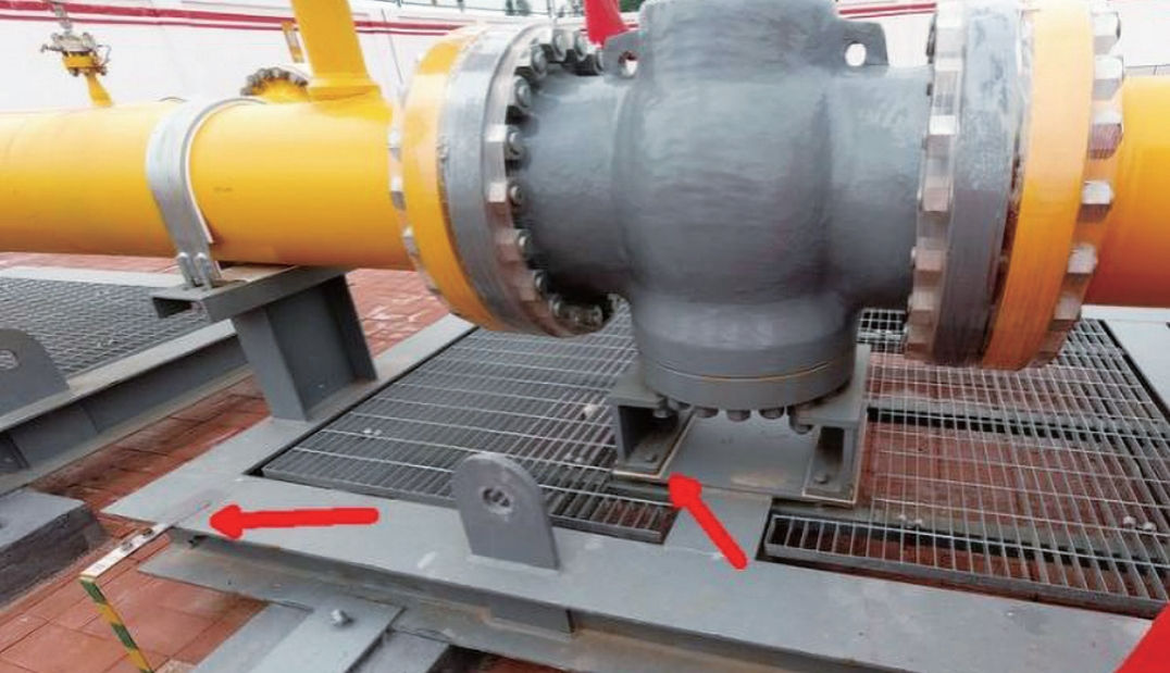 (1)管道支撑方式不合适。针对较大口径管道的大重量阀门支撑设计,没有支撑阀座而是支撑阀门两端的管道,造成阀门连接法兰受力不均衡、管道翘起,管道系统不稳定,容易产生共振(图 1)。