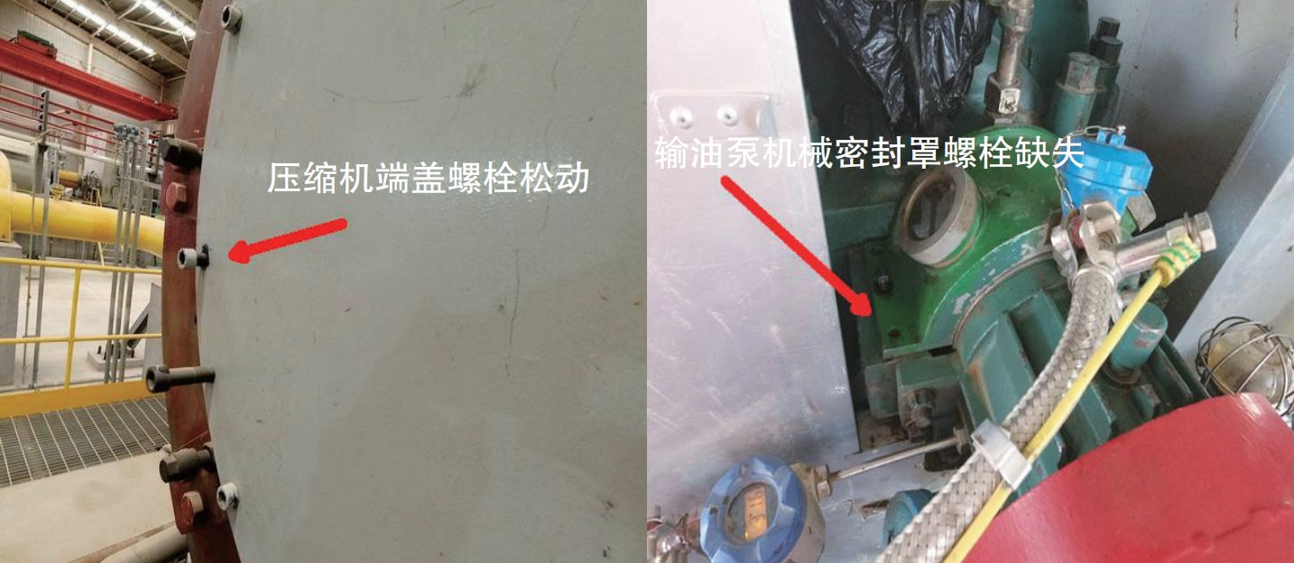 (2)设备维护管理不善。在机械领域中,安装不完善的设备不能运行,运转设备上不允许放置无约束配件,这是对运转设备管理的基本要求。在现场检查中曾发现,某天然气管道压气站运行中的压缩机端盖螺栓紧固不到位,某输油管道输油泵机械密封罩的螺栓孔没有安装螺栓以及密封罩处于无约束状态(图 7)。压缩机是高转速、高压力设备,在端盖螺栓安装不妥状态下运行是容易引发事故的危险隐患。